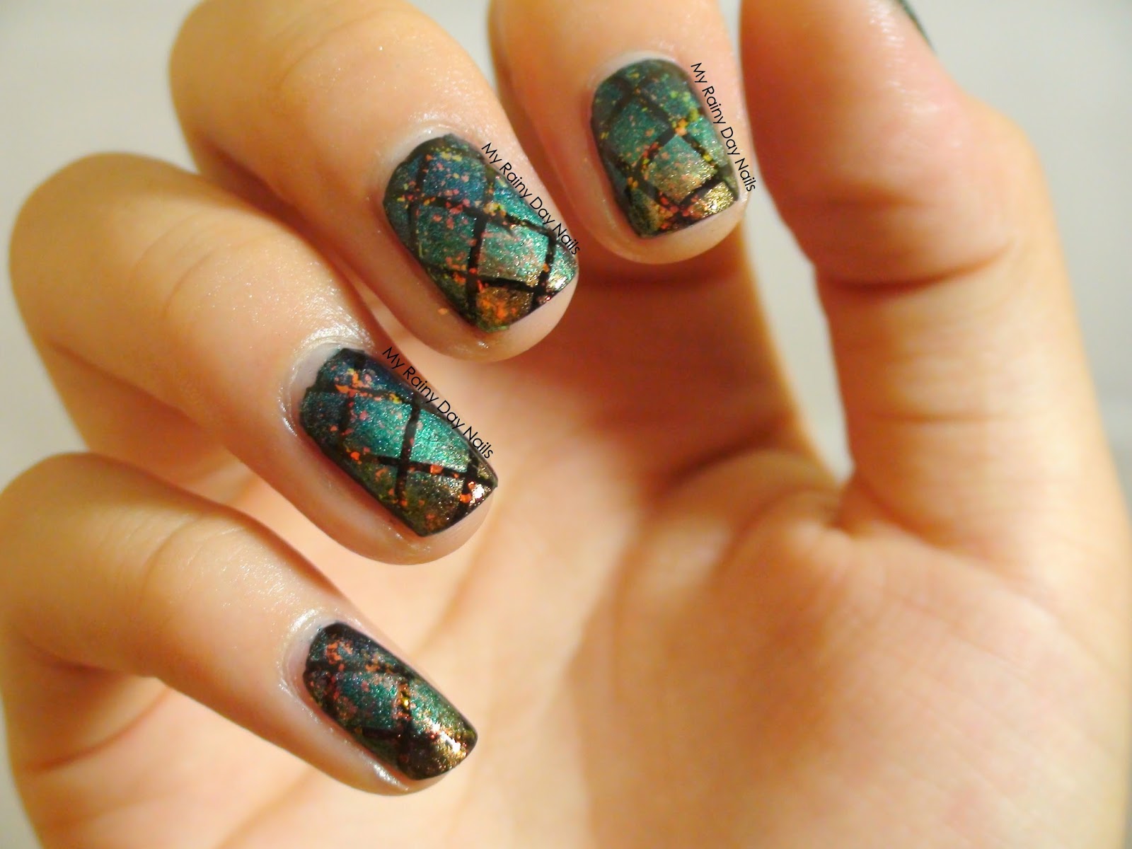 So these are the mermaid nails I came up with. Whenever I think about mermaids I think about colors like gold and metallic greens and blues, like the polish above. And I also think of this: